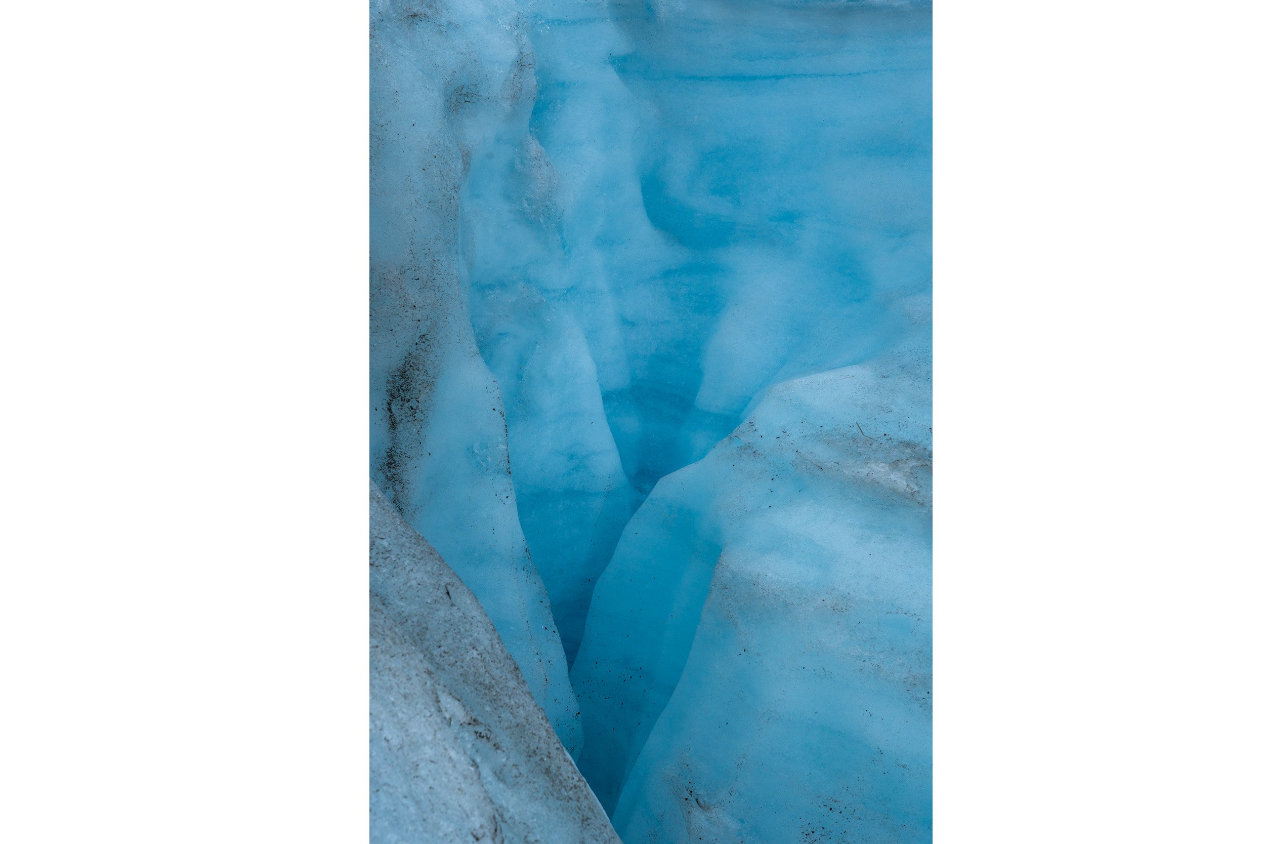 Wolverine Glacier. Glacier ice is blue because the red (long wavelength) part of white light is absorbed by the ice and the blue (short wavelength) light is transmitted and scattered. The longer the light path travels in ice and the more dense the ice, the more blue it appears.